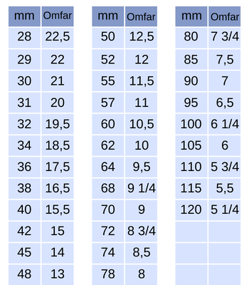 Maskevidde oppgis i mm pr. halvmaske, det vil si avstanden fra knute til knute. Fra gammelt av ble maskevidden oppgitt i omfar pr. alen (0,627mtr.). Omfar er ganske vanskelig å regne, derfor legger vi med en ferdig oversikt nedenfor.