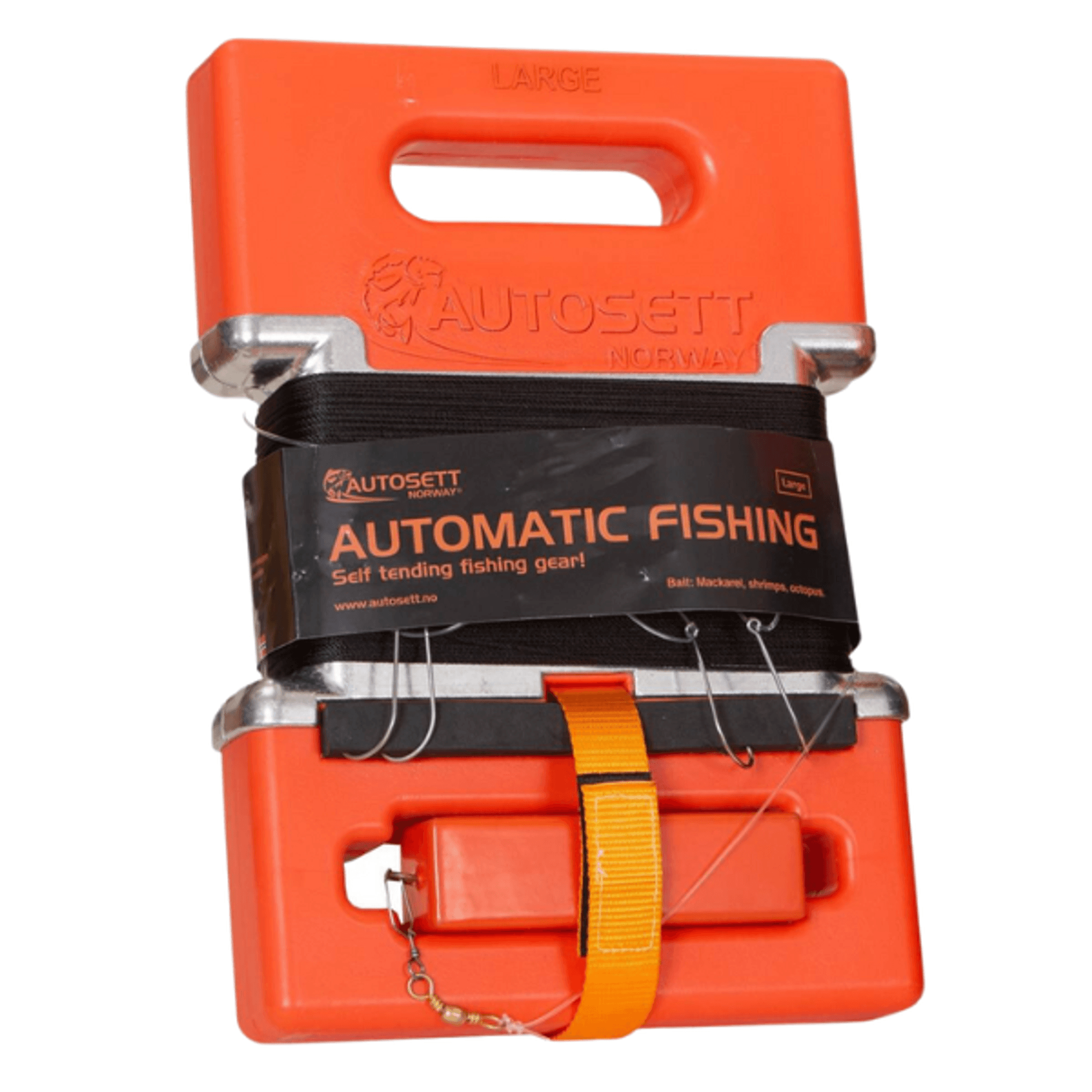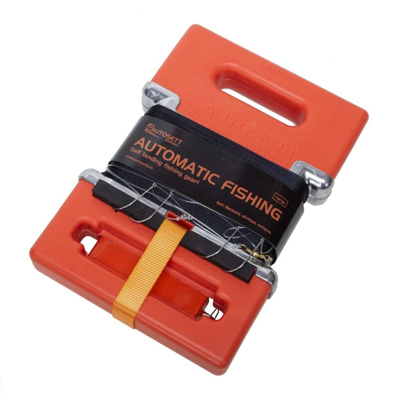 Autosett setter seg selv! Fisker av seg selv! Bruksanvisning: Løs loddet, sett agn på krokene og slipp. Snøret ruller ut til loddet når bunnen og stopper. Autosett er nå oppankret og flyter. Fisket er startet!