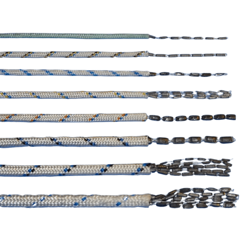 P.P blyline består av 2 deler. Kjernen er av minimum 3 stk leddet blytråd,, utenpå en strømpe av P.P.