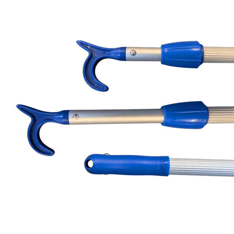 Båtshake av høy kvalitet med riflet aluminiumsskaft (25 mm Ø) og solid blå plastkrok. Produsert i Sverige.