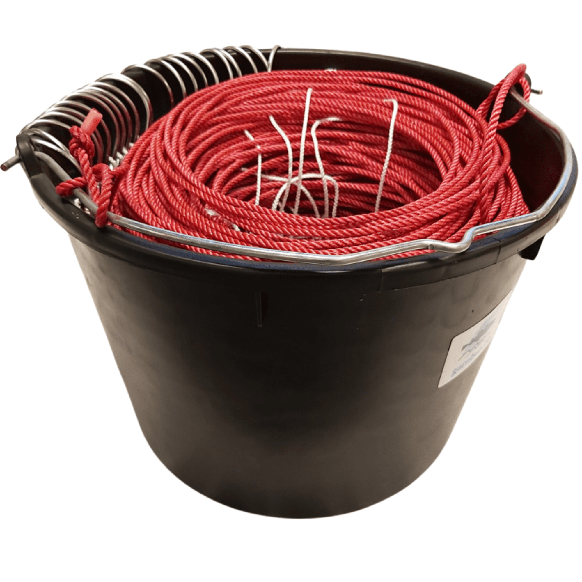 Linen er dradd i 20 l stamp m/ krokene hengt på kanten.