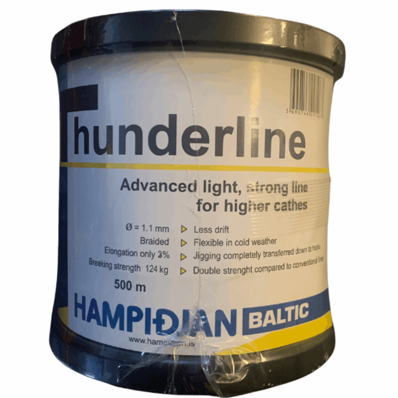 JUKSA DNG THUNDERLINE 1,1 MM 500 M er en multifilamentline med utrolig bruddstyrke på 124 kg. Tynnere line taes ikke så lett av strøm og avdrift og gir mer korrekt fiske ved presis kroking av fangst. Anbefaler bruk av Juksastrikk når denne linen nyttes på juksamaskin.