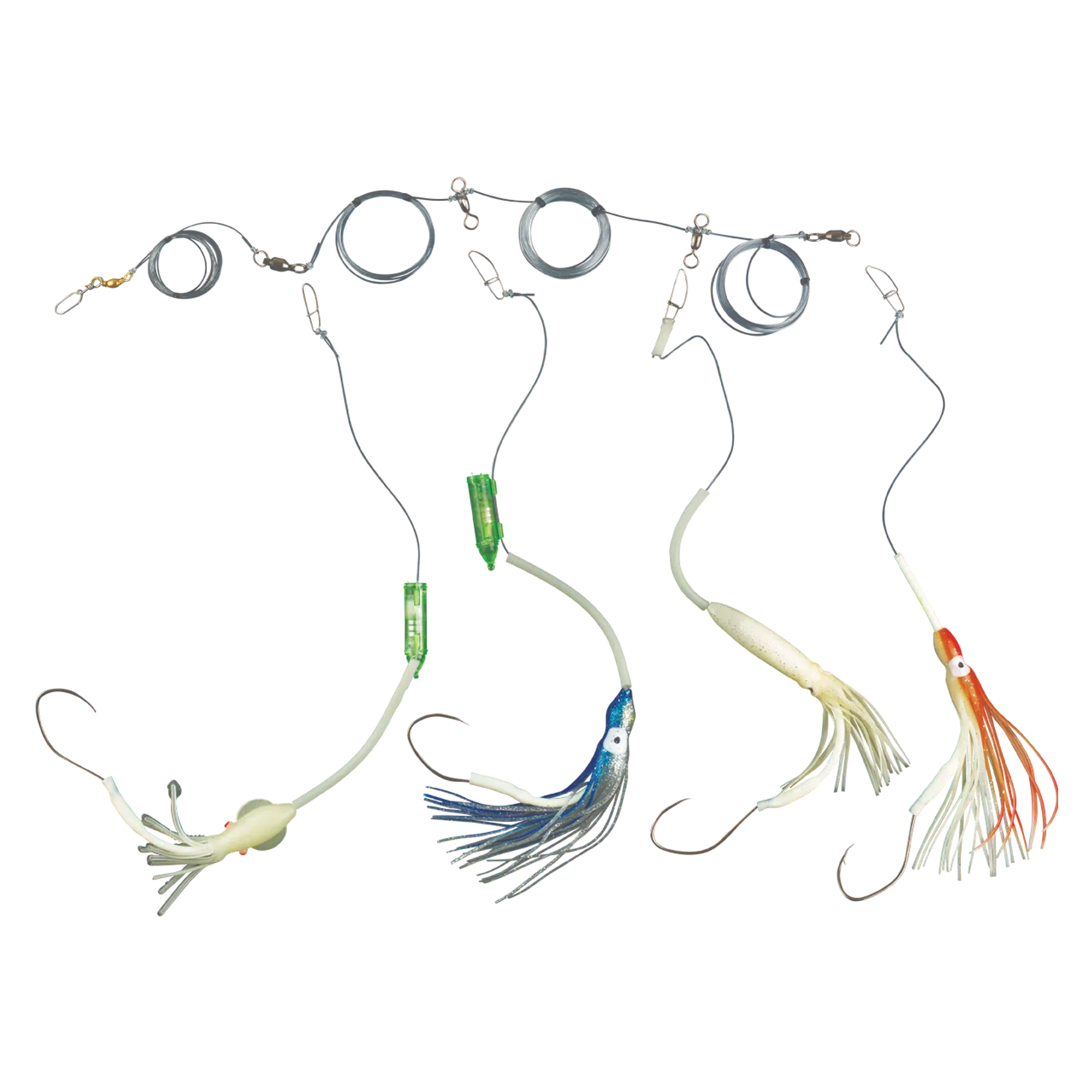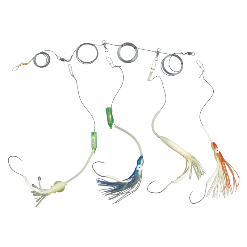Her er havfiskeriggen som gir deg mange valg. Hovedsnøret er utstyrt med to kraftige svirvler med 2,5 meters mellomrom, og med i pakken følger det fire forskjellige opphengere slik at du selv kan avgjøre hva du vil fiske med fra tur til tur. Dette er et allround paternoster som kan brukes til mange forskjellige arter, men opphengerne som følger med er beregnet på storfisk. Fileter av sild, makrell eller sei funker ypperlig som agn til disse. Husk å bruke elastisk surretråd for å få agnet til å sitte bedre.
